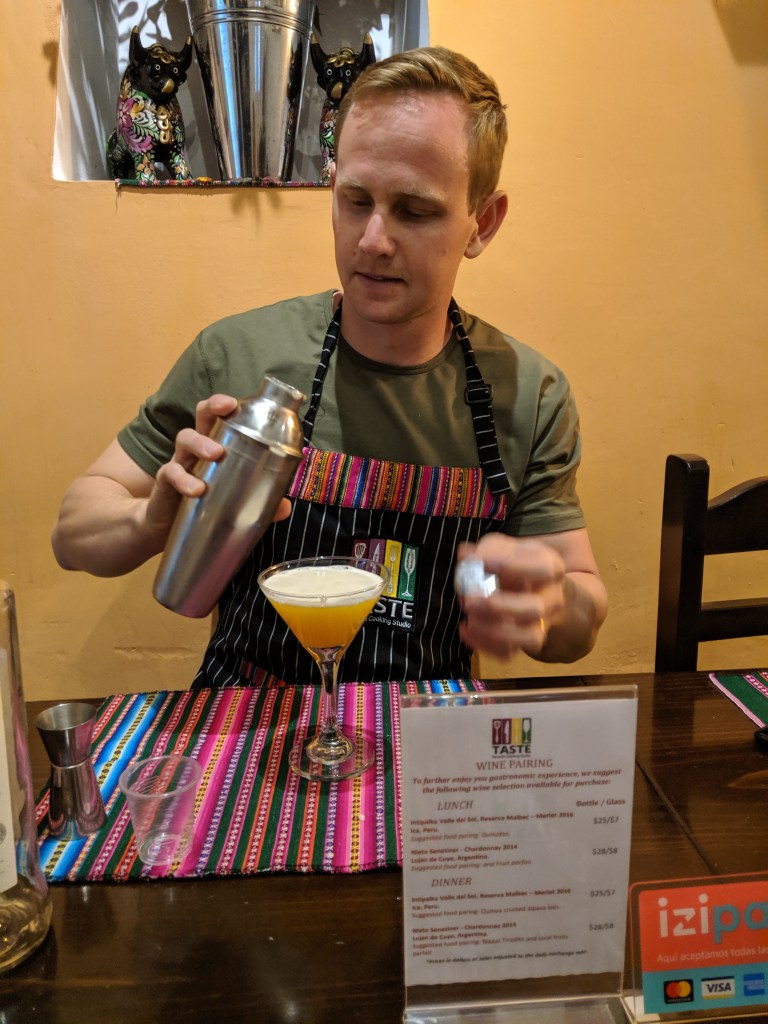 - Passion fruit pisco sour, which is a typical mixed drink in Peru. It is a mix of pisco, simply syrup, egg white, bitters and usually lime, but we used passionfruit. Pisco is made by distilling fermented grape juice into a high proof spirit.