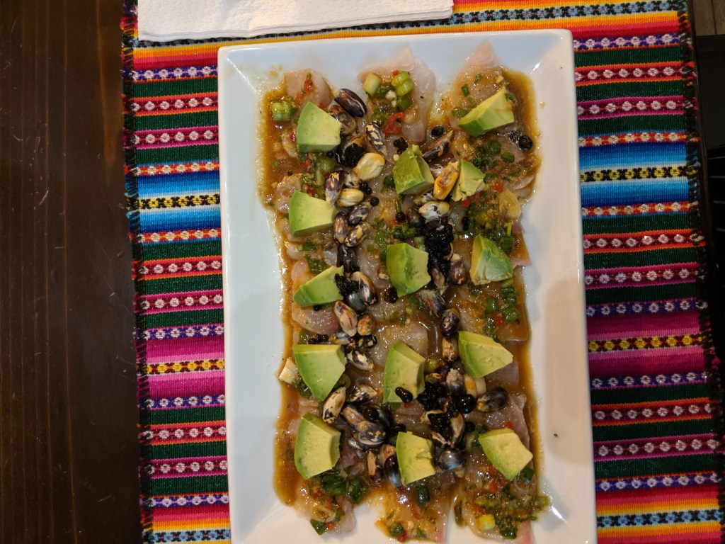 - Sashimi style fish marinated in ponzu with avocados and cushuros.