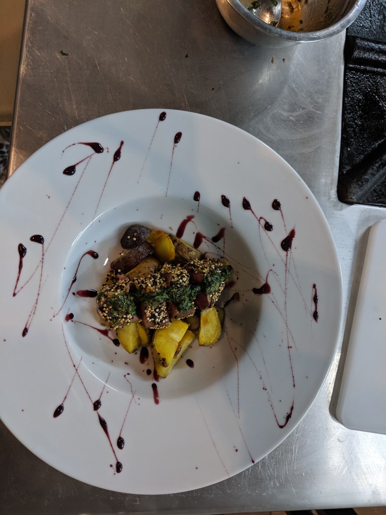 - Quinoa crusted alpaca with roasted potatoes and smoked chimichurri.