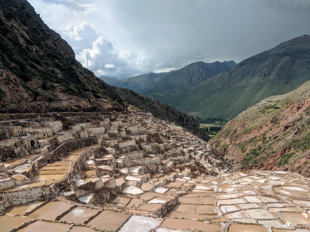 After Ollantaytambo, we stopped for lunch on our way to the Maras salt mines. It is a very pretty drive to Maras and interesting to see how the salt is harvested. Water, naturally salt- infused, flows down from the mountains and settles in the pans. As the water evaporates, salt remains and is extracted with simple tools. The only way to get a plot is by having a family member pass it on to you.