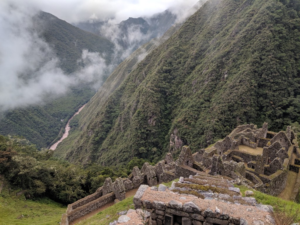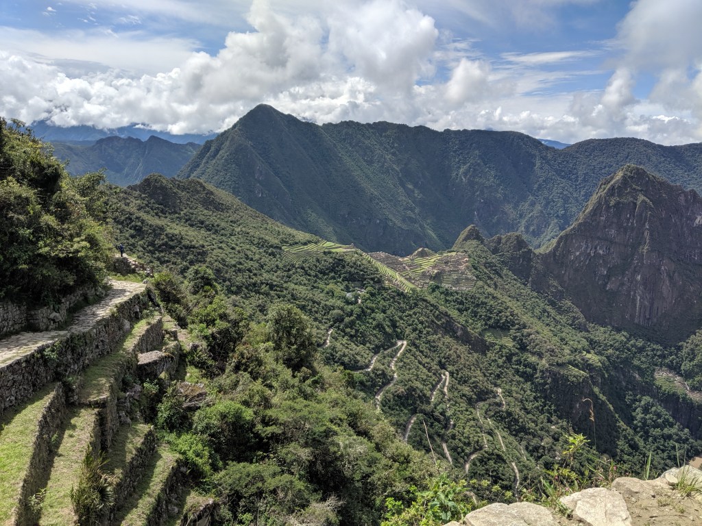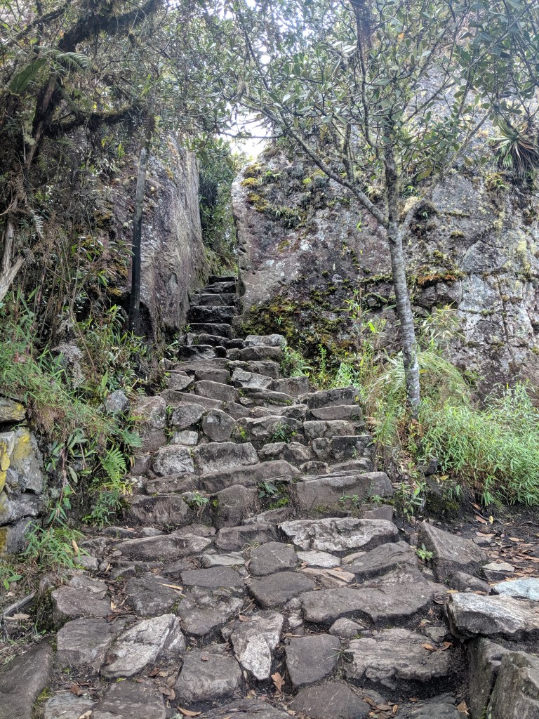 The hike was absolutely beautiful and we hiked through the jungle and then on the side of the mountain. It was overcast which was nice since the hike was somewhat difficult. The beginning was a gradual incline with some parts that were very steep. The thing that made it difficult was the higher elevation. The first stop was at Winay Wayna which is an old incan site with an elaborate water fountain, temples and some agricultural terraces. THe backdrop of this site drops off a cliff with beautiful mountains surrounding the area.