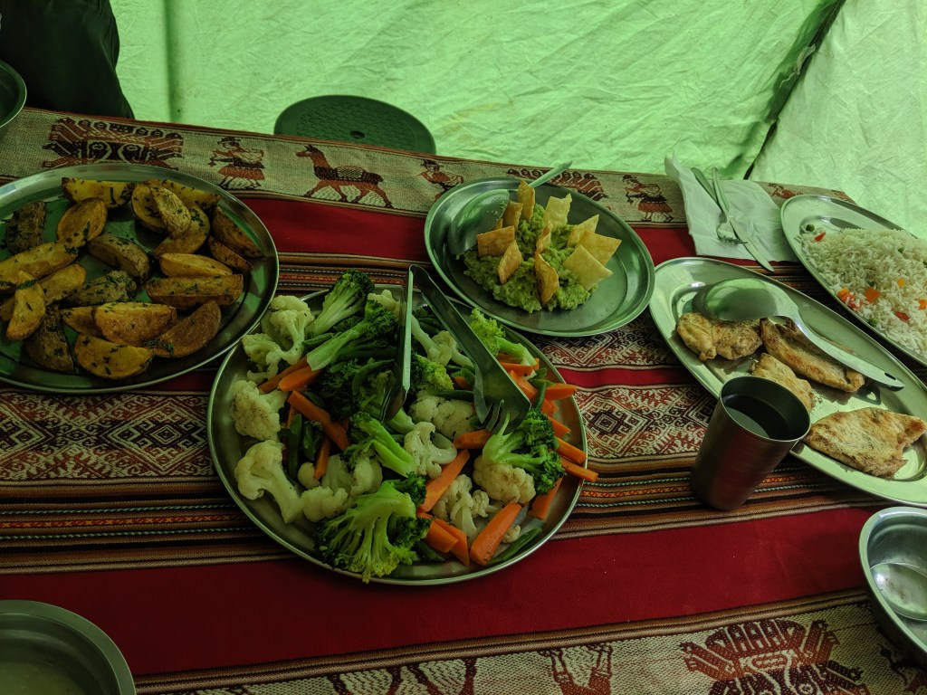 We then had lunch at the campsite where the other hikers would be sleeping for the night. The porters carried up all of the cooking supplies and tents which makes me respect them so much. They quickly hike up with about 60 pounds of extra supplies. For lunch we had chicken, rice, potatoes, broccoli, guacamole and asparagus soup.