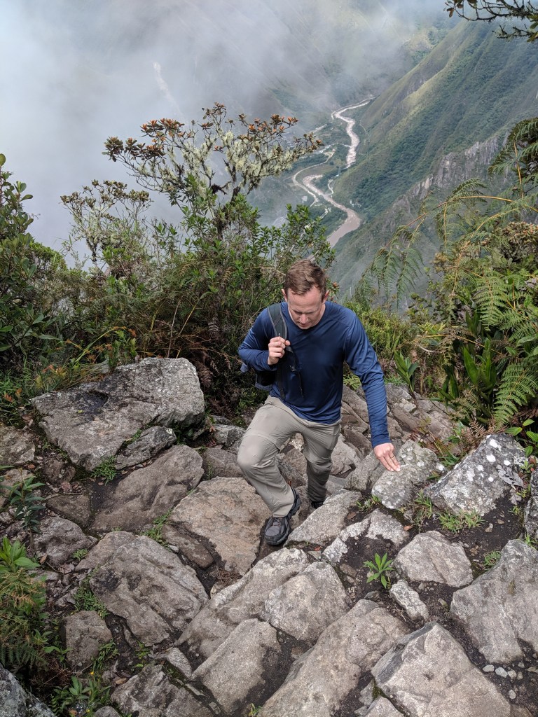 We decided we would do the additional hike up to the top of Machu Picchu mountain. At this point our tour guide left us and we were on our own for the rest of the day. The hike up Machu Picchu mountain was extremely difficult and was straight up stairs the whole time with no rest. There were also parts of the hike where you were on the side of a cliff with about a 2 foot trail. It took us about 1 ¼ hours round trip and you climb 2000 feet in elevation. You can also hike up Huayna Picchu which is not as tall, but a bit more treacherous. It was a hard hike but once you got to the top, there were absolutely gorgeous views over Machu Picchu. The hike down is hard since there are so many stairs and your legs are already tired.