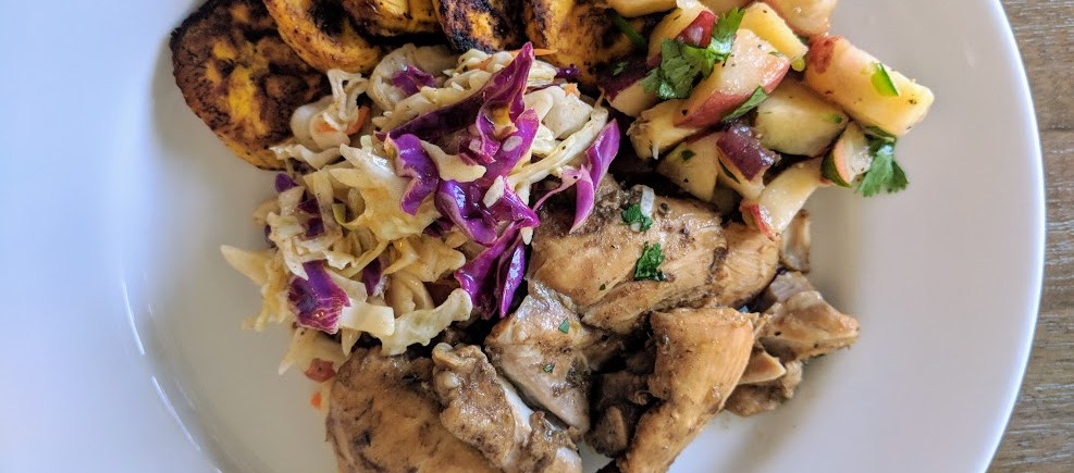 Jerk Chicken, Plantains, Coleslaw and Peach Salsa