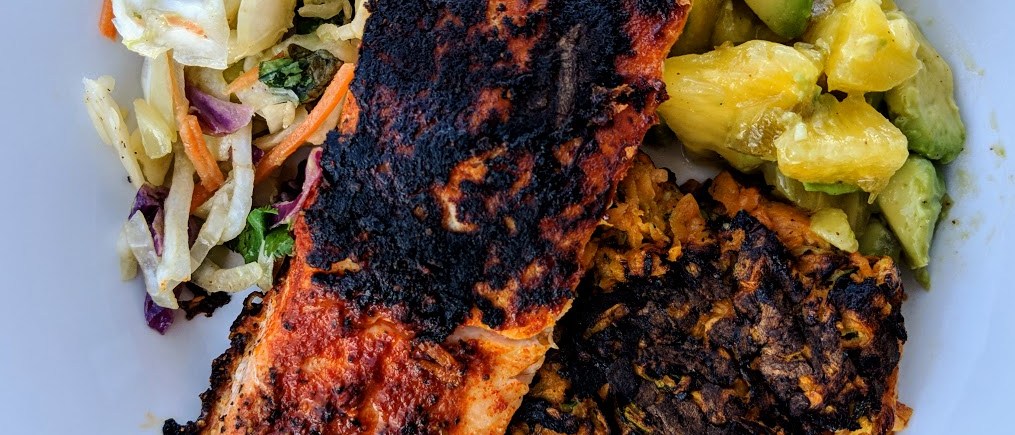 Pan Seared Salmon with Zucchini and Sweet Potato Pancakes Served with Pineapple and Avocado Salsa