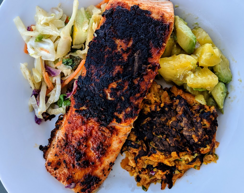 IMG_20180709_183641 Previous Published July 11, 2018 at 1015 × 802 in Pan Seared Salmon with Zucchini and Sweet Potato Pancakes Like Loading...