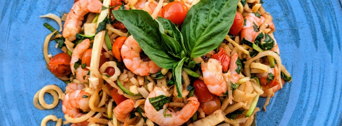 Spiralized Parsnips with Shrimp, Tomatoes, Basil and Garlic