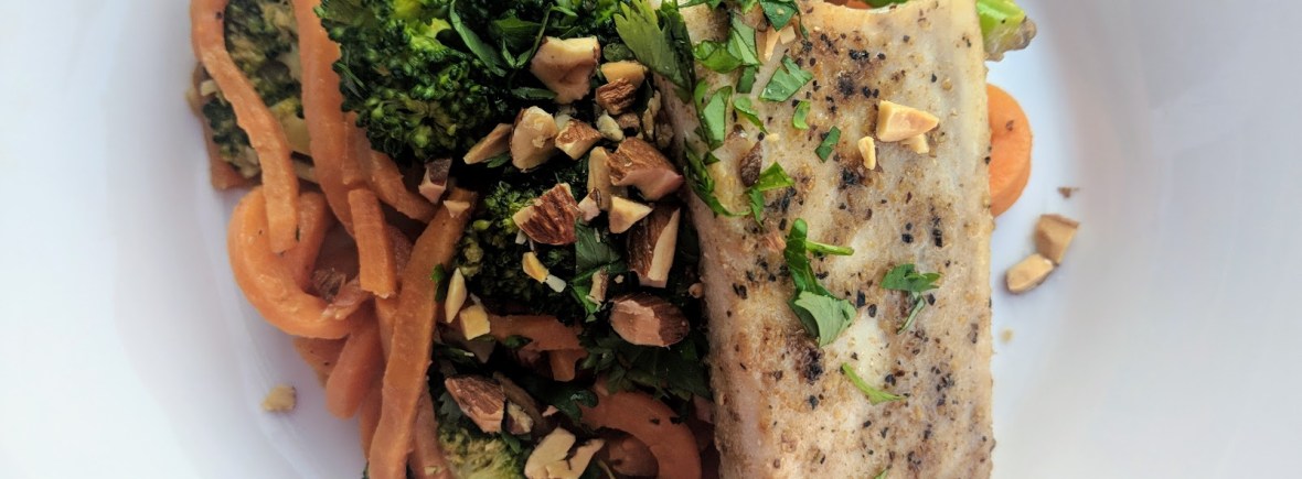 - While the “noodles” are cooking. Season the Mahi Mahi with salt, pepper and coriander. Heat ½ tablespoon oil in a separate skillet and cook the Mahi Mahi about 5 minutes on each side.