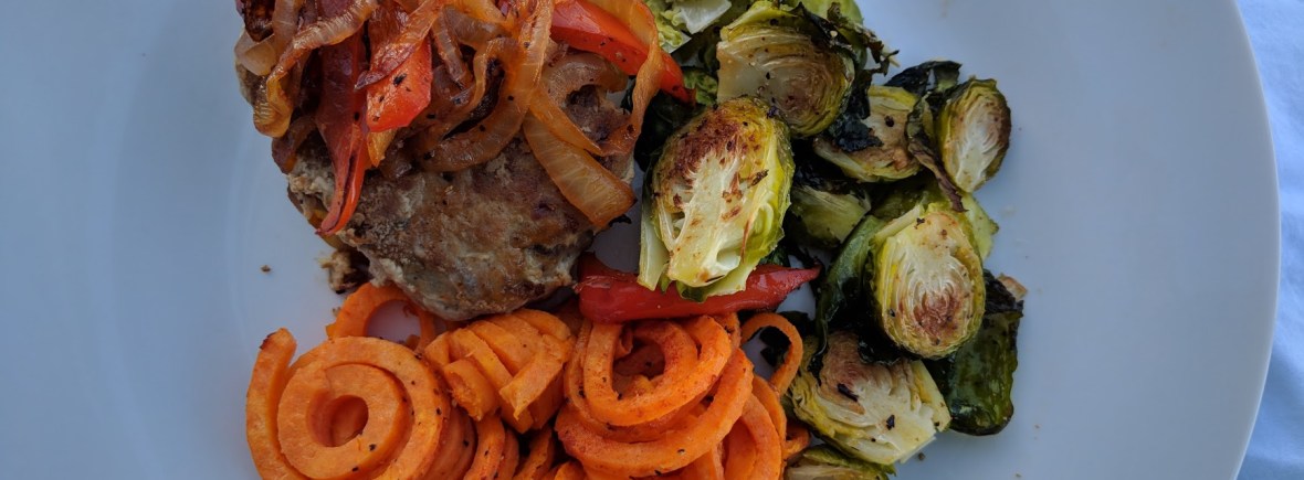 - Top burgers with onion and bell pepper. Serve with spiralized sweet potatoes and brussel sprouts.