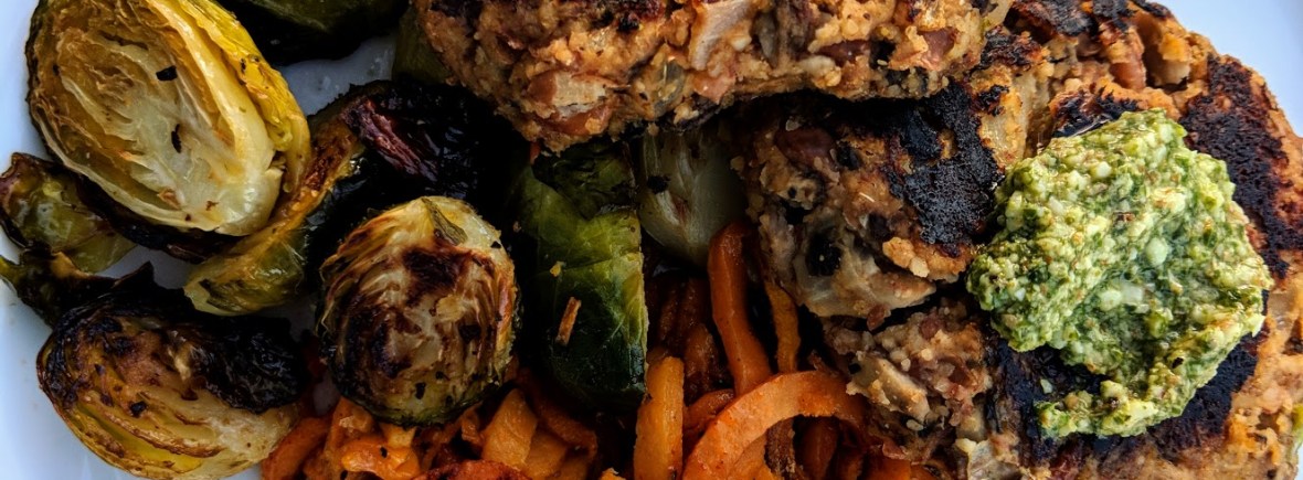 Mushroom Veggie Burger, Spiralized Sweet Potato and Roasted Brussel Sprouts