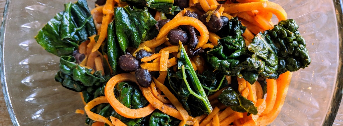 Spiralized Sweet Potato, Black Bean and Kale Skillet