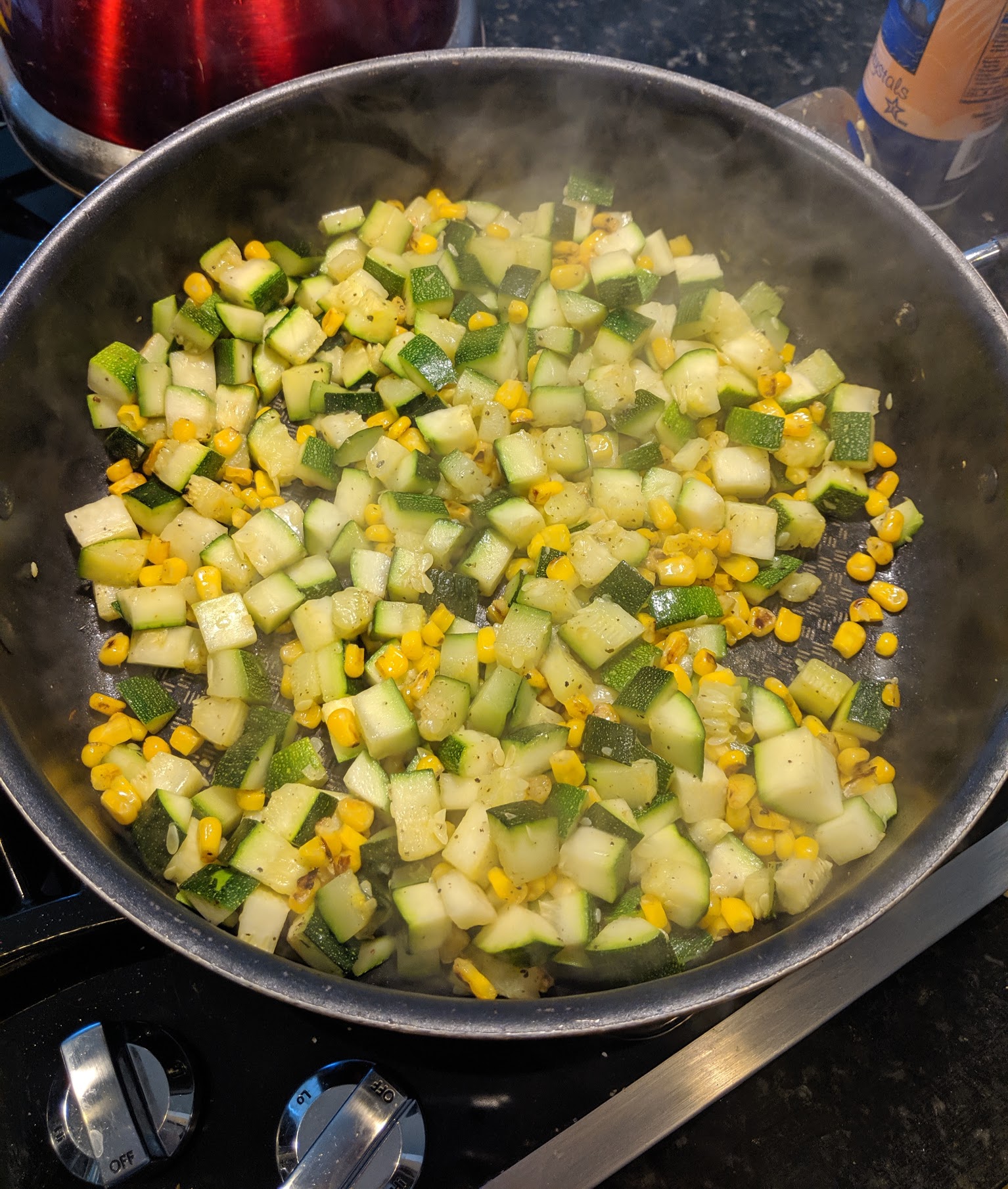 - On the stovetop, saute the cubed zucchini and thawed corn in 1 tablespoon of olive oil, ½ teaspoon salt and ½ teaspoon ground pepper until lightly browned, about 8 minutes.