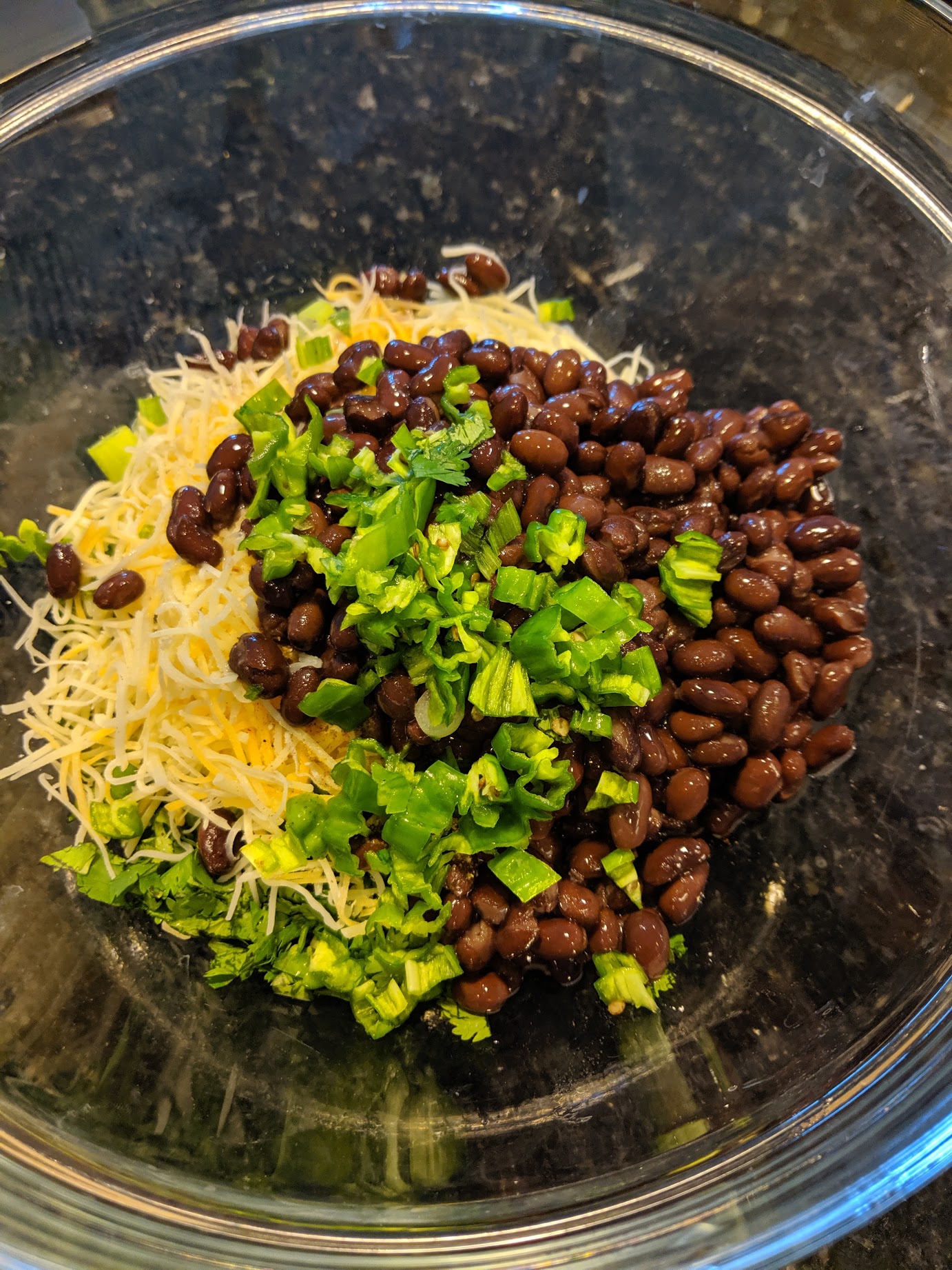 - While sauteing, mix together the black beans, cheese, green onions, cilantro, chiles, cumin, ½ teaspoon salt and chili powder.