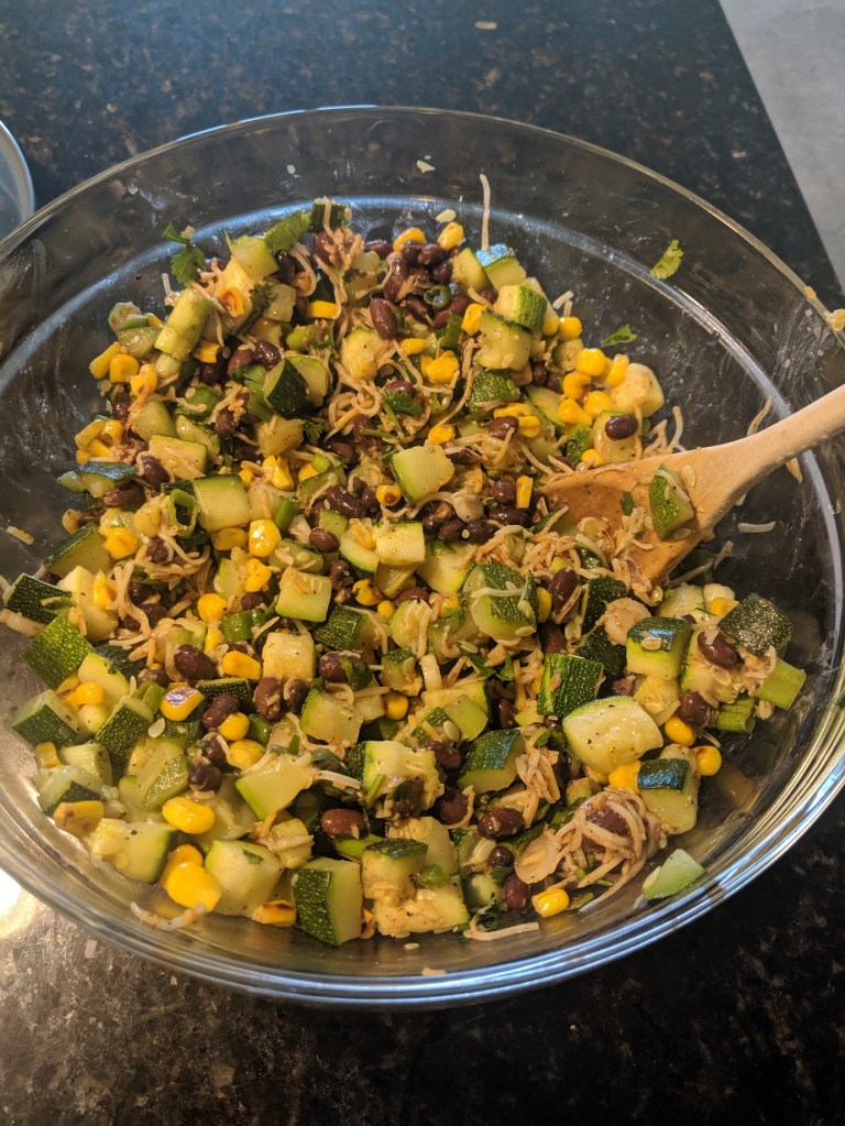 - Once zucchini and corn are browned pour over the bean mixture and combine.