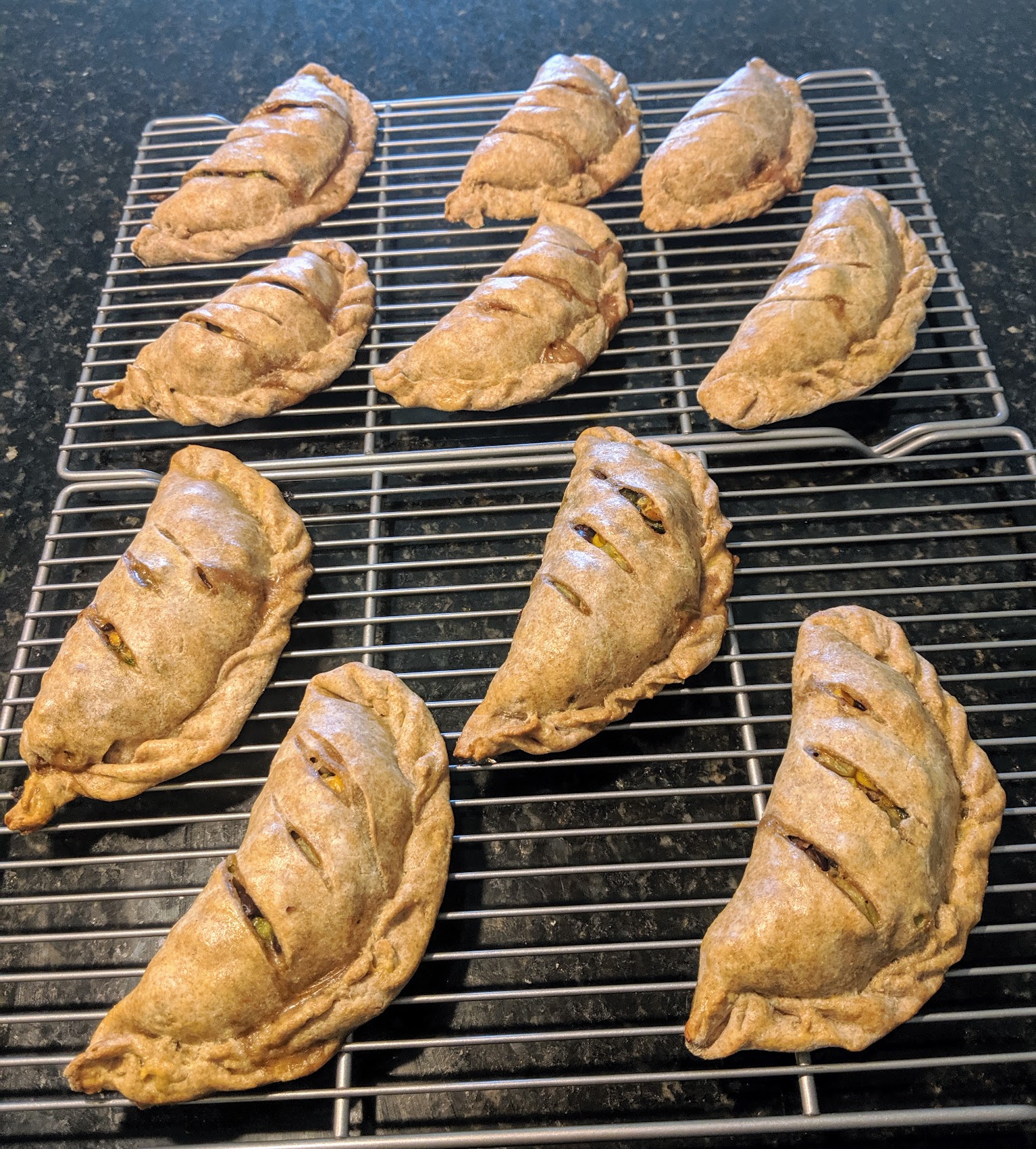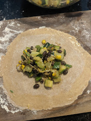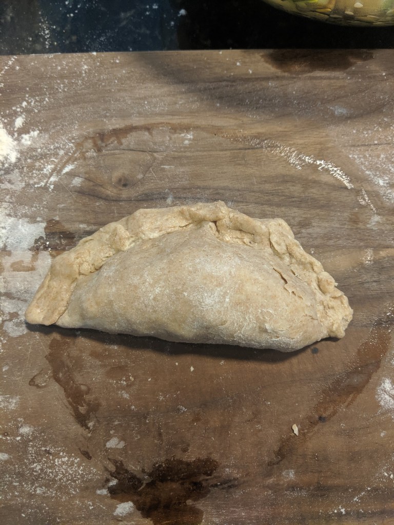- Divide the dough into 10 equal portions. Shape each portion into a ball and roll into a 5- to 6-inch circle about 1/8-inch thick on a cool, lightly-floured surface. Working one at a time, place 1/3 cup filling into the center of the circle. Moisten the edges with the egg wash. Fold one edge over the top of the filling to create a half-moon shape and crimp the edges to seal.