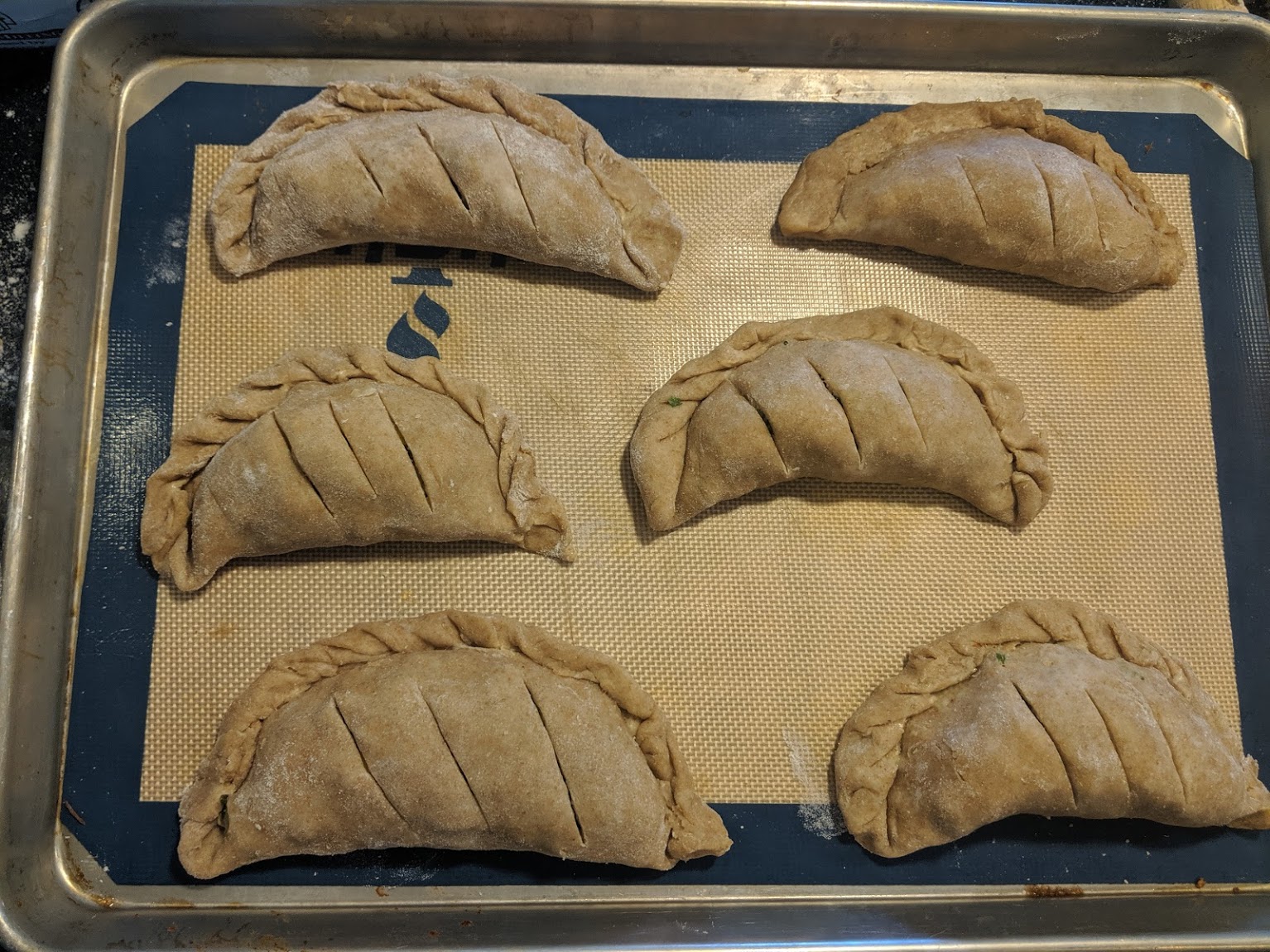 - Place the empanada on a parchment-lined baking sheet, brush tops with egg wash, and repeat with remaining dough. Slice a few small slits in the center of each empanada to help release steam while baking.